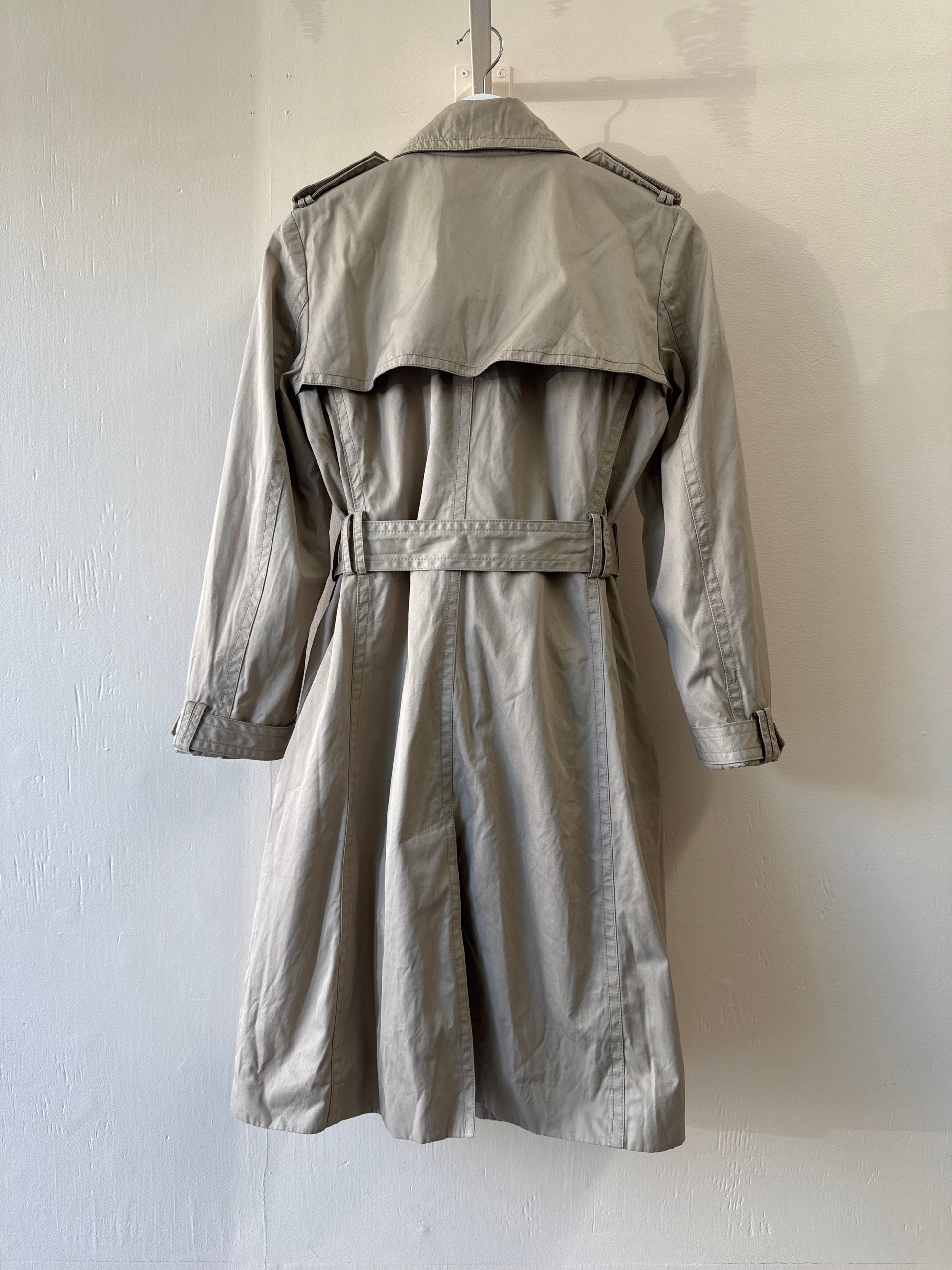 The main color is beige with a dark brown belt buckle and buttons.