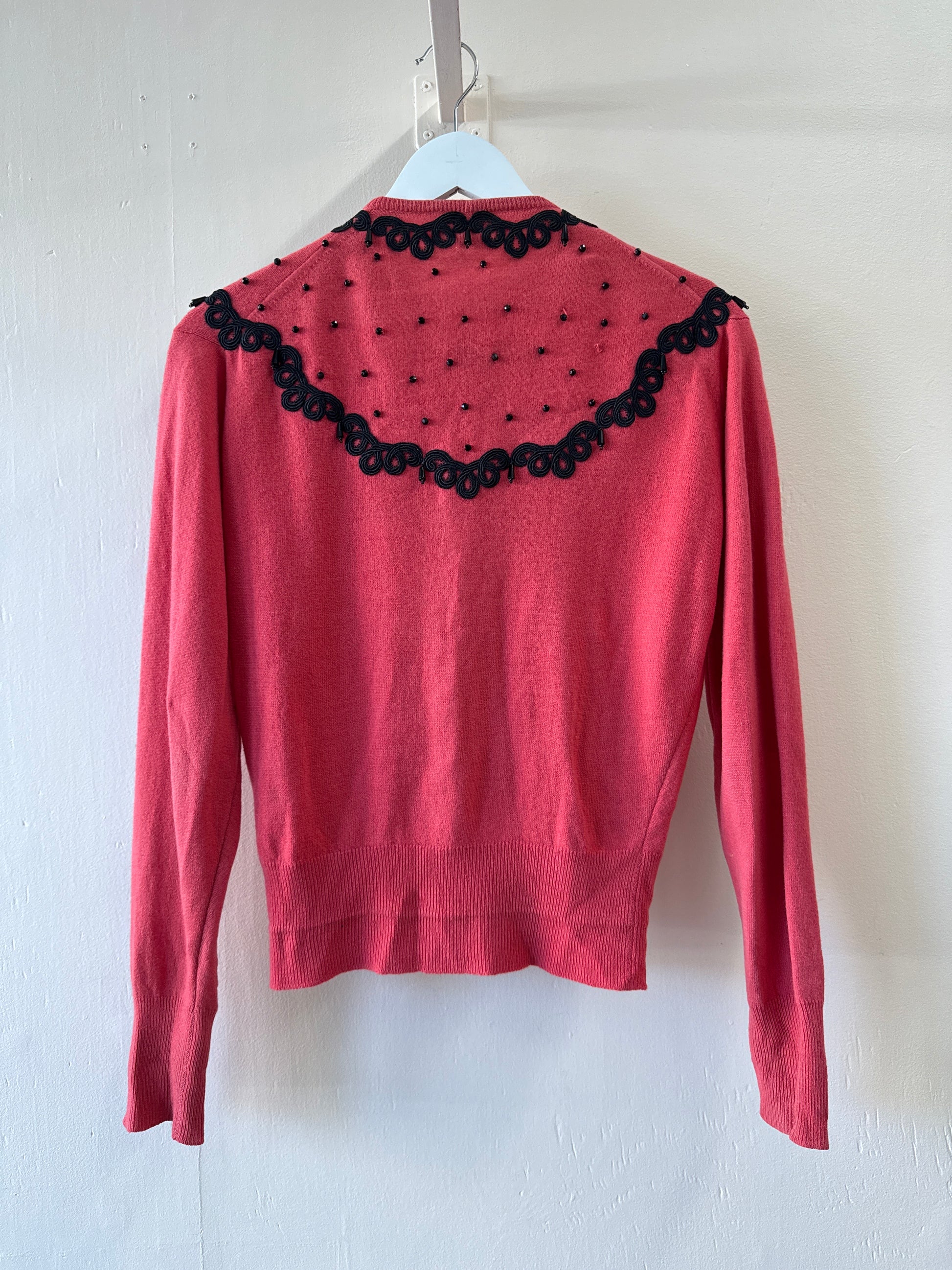 Color is salmon pink with black embroidery, buttons, and accents.