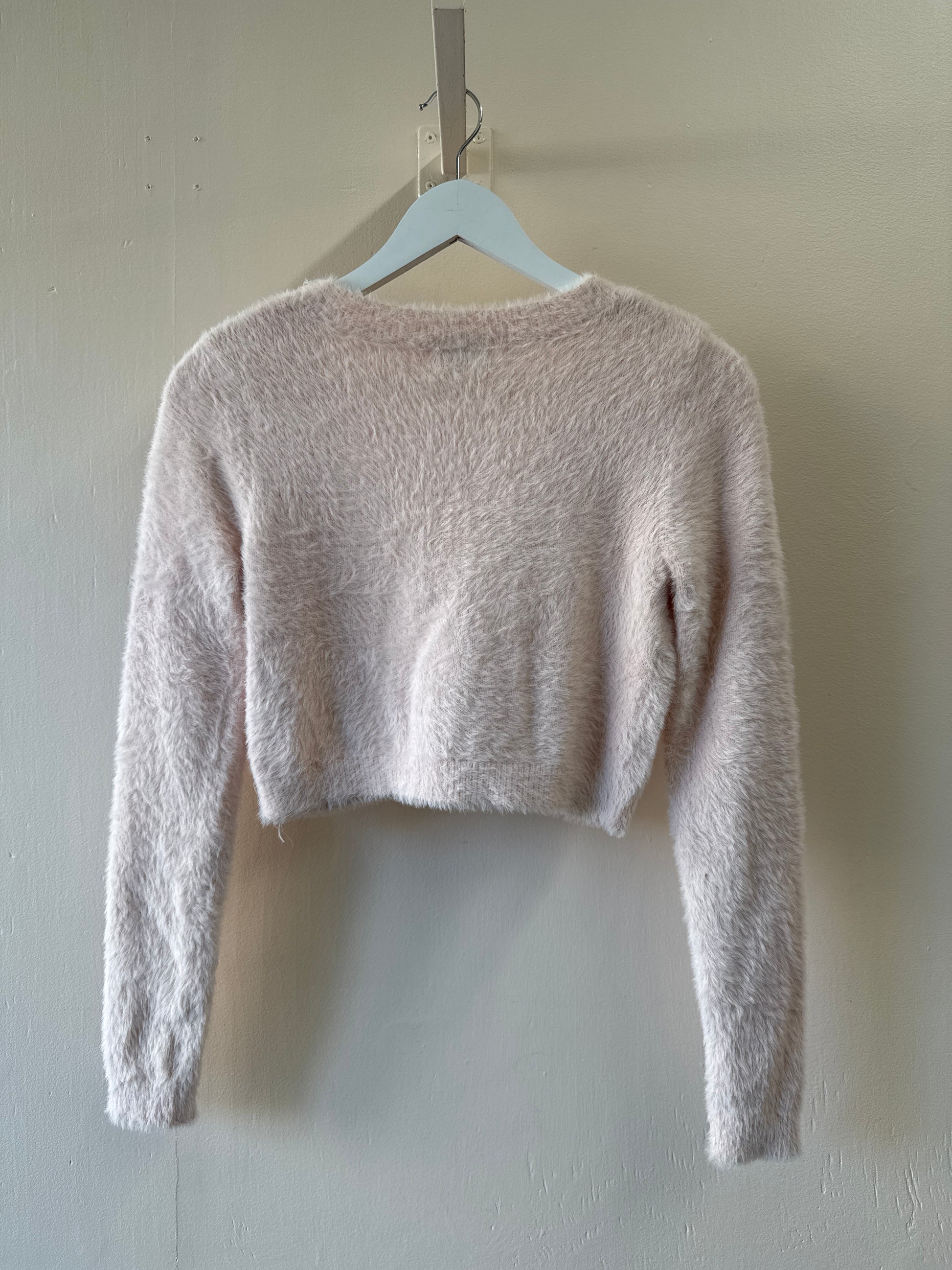 This Sunday Best Fluffy Cardigan is a stylish and unique second-hand piece, perfect for sustainable fashion lovers—or anyone who wants to hear, “Oh wow, where did you get this!?,” at least once a day.